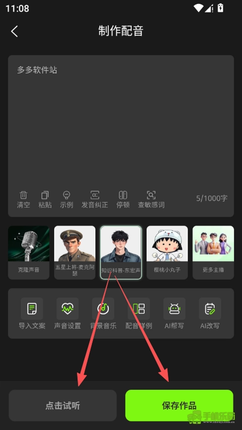 文字输入完成后,就能依据作品风格挑选适配的配音声线,支持切换主播并调整播放效果