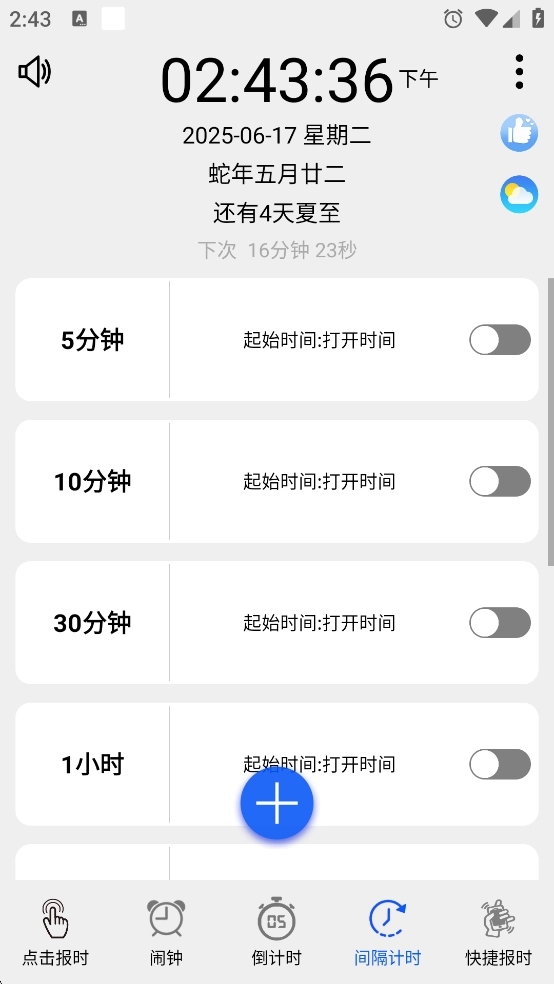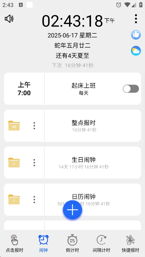 语音报时闹钟是一款实用性很强的手机闹钟应用,功能相当全面,不仅支持重响功能,还能让用户自定义选择播报内容,像当前时间、农历日期、阳历日期、星期几、24节气等都可以包含在内。用户也能够设置语音闹钟,并且可以自定义导入音乐或者特殊音频来作为闹钟的响铃。此外,这款闹钟还支持多种语音库,同时具备地方方言报时的功能,比如粤语、四川话、闽南话等都有涵盖,有需求的朋友可以来体验一下!