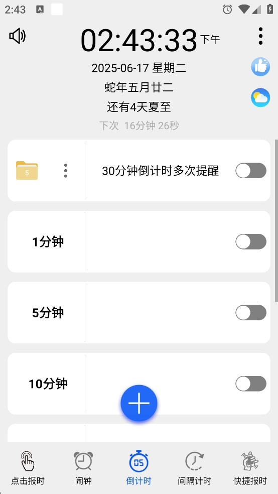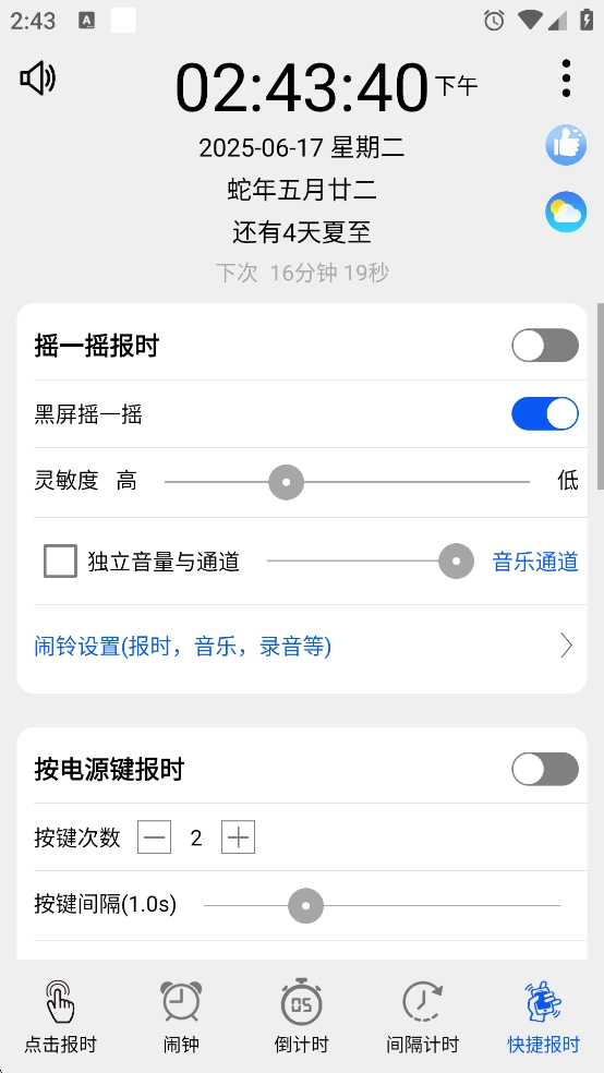 支持桌面小工具快捷报时、锁屏快捷报时以及摇摇报时功能。