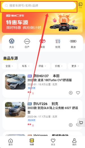 用户点击下方车源,即可进入车源页面,能选择查看单品车源或组包车源,还能通过地区、车系、评级、价格及更多条件进行筛选,挑选出自己心仪的二手车。
