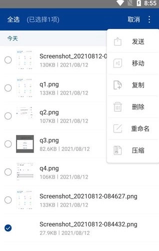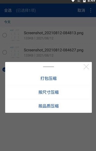 您可以按照以下步骤操作:先点击文件图标(位于文件名左侧)来选中需要压缩的文件,接着在任意一个已选中文件的文件名上点击,从弹出的菜单里选择“压缩”功能,然后根据需求设置相关选项和压缩方式,最后点击确定按钮就完成了。