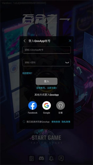 3、游戏内可选择四种登录方式,包括访客登录、QooApp账号、脸书及谷歌账户,推荐直接使用访客方式以便后续绑定账号。