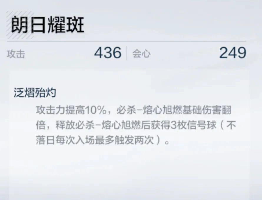 专属武器自带10%攻击力加成,还能让大招的基础倍率直接翻倍。对于大招基础倍率突破两万的不落日来说,这个提升效果相当显著。大招释放后会生成3颗元素球,对角色的续航能力也有一定助力。不过这两项效果都不会对循环流程造成影响,完全可以用五星武器来过渡使用。