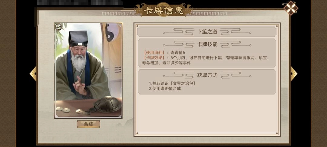 (1)[袁天罡]开启游戏,持有专属卡:[参天透机],在使用提升寿命的丹药时,能额外增加20%的寿命;还可消耗一定寿命,查看自身剩余寿命。