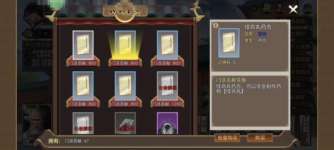 (2)通过[副职:郎中]积攒医馆贡献,在各地医馆的积分商店换取[续命丸](药方),背包使用后可在自宅→炼丹室,需要自行炼制。