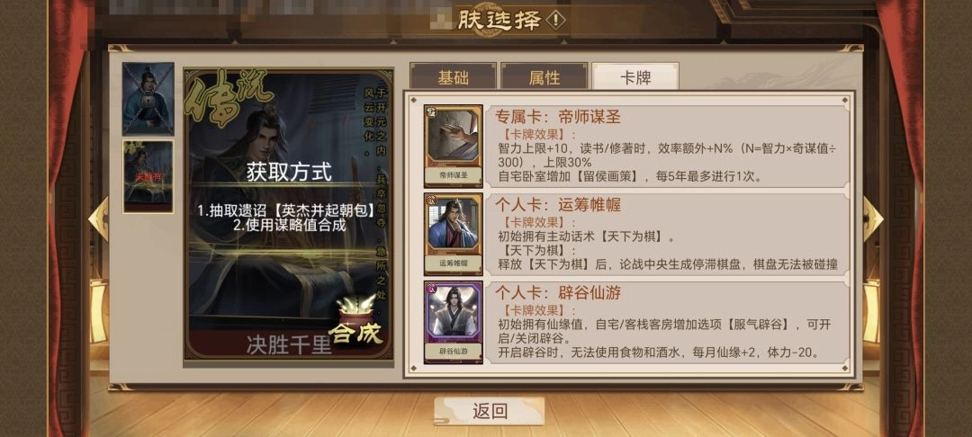 (3)开局携带名臣[张良:决胜千里(金色皮肤)],将好感度提升至挚友,即可向其请教个人卡:[辟谷仙游]。