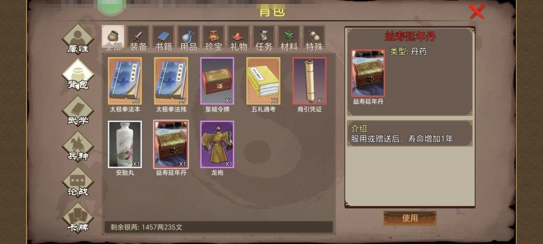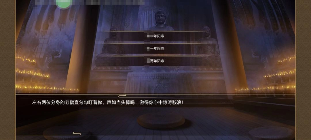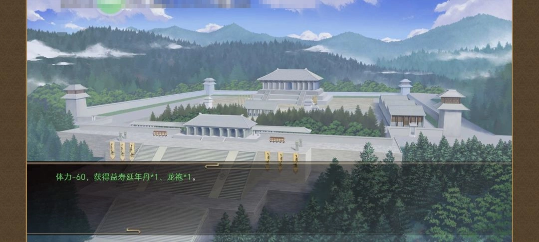(2)事件:净堤寺,剧情选择赌两年阳寿,成功后失去60体力,获得:[益寿延年丹]×1+[戏子]副职宝物:龙袍(概率获得,失败会降低两年寿命,建议SL)。