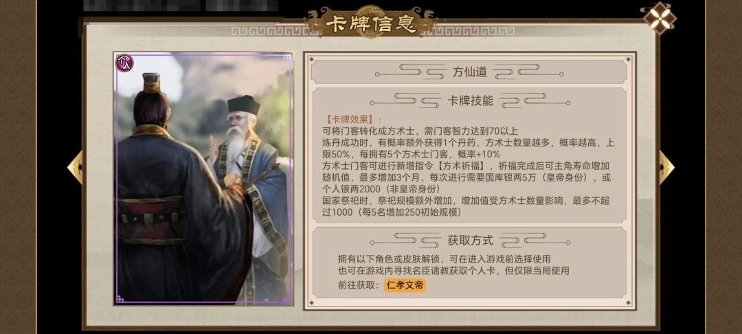 (3)开局携带门客[刘恒:仁孝文帝(金色皮肤)],将好感提升至挚友,即可向其请教个人卡:[方仙道]。
