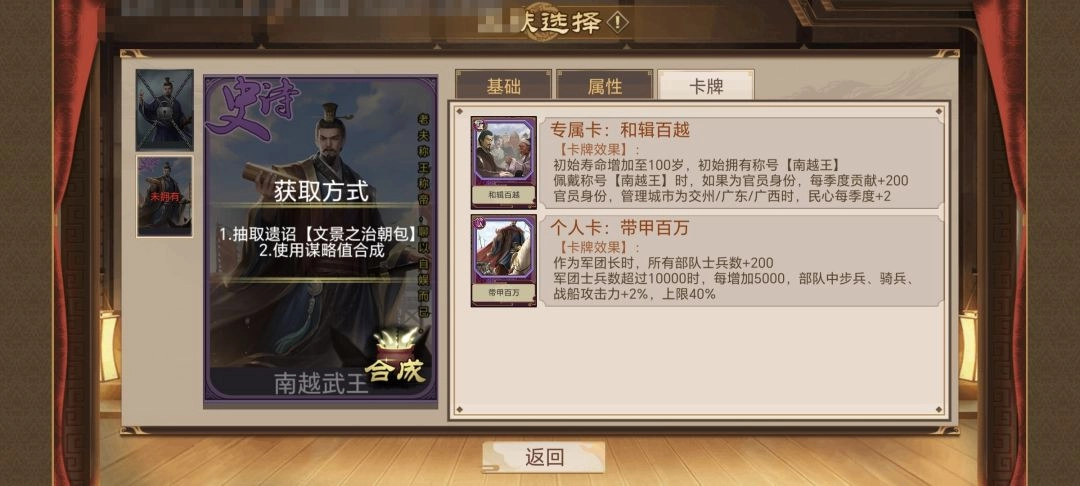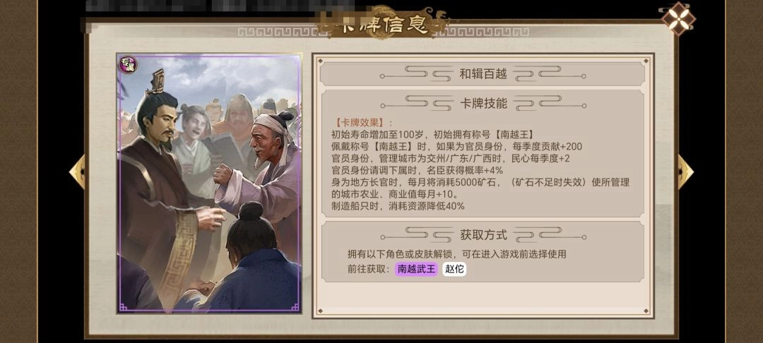 (1)[赵佗]开局游戏,会携带专属卡:[和辑百越]。