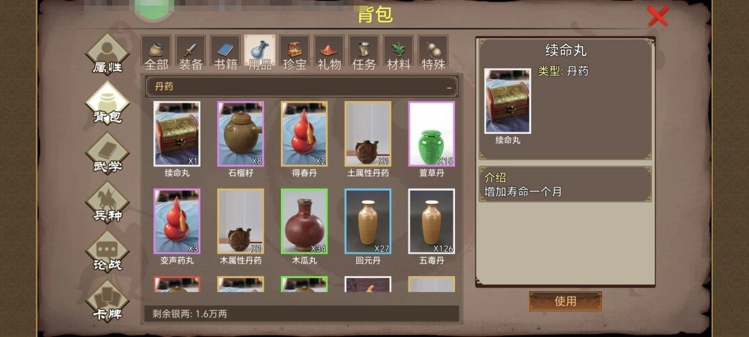 (3)武侠线,拜师武当,考核成为亲传弟子,门派→门派商店,换取[续命丸](药方),背包使用后可在自宅→炼丹室/门派→太.君.炉,需要自行炼制。