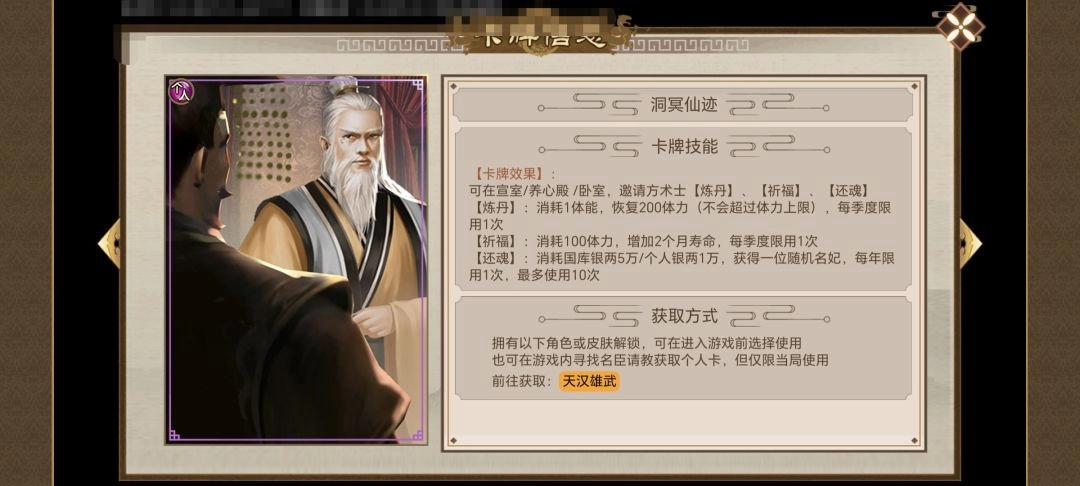 (3)开局携带名臣[刘彻:天汉雄武(金色皮肤)],将好感度提升至挚友,即可向其请教个人卡:[洞冥仙迹]。