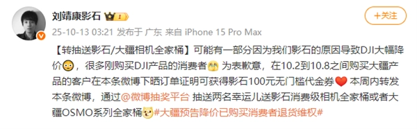 就在大疆深陷舆论时,影石创新CEO刘靖康今天突然致歉并发放无门槛代金券。
