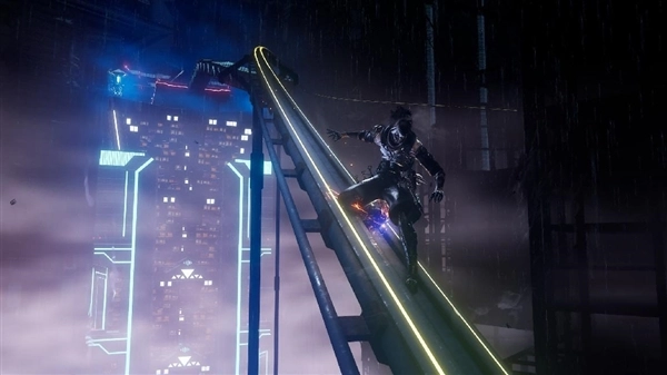 《忍者龙剑传4》的玩法流程采用了区域探索与线性关卡的结构。以近未来东京为蓝本的地图打破了以往了平面化局限,以上下式结构给玩家带来了三维垂直的探索空间。崩坏区的科技都市区场景配备了抓握判定系统,只要是视觉可见的横梁、绳索均可攀爬,玩家需用壁走、跳跃的移动组合与机械义肢的钩爪配合,穿梭于场景之间。冥界深渊区域则可通过新增的”空中飞燕“衔接滑翔并调整落点,抵达悬浮岩石处。空灵水体区域则能利用浮力实现“水下呼吸”潜水,解锁神社遗迹群的隐藏区域。