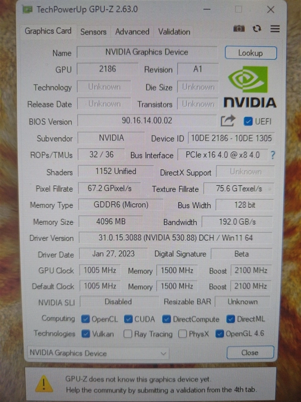 GPU-Z识别的信息残缺不全,型号什么的都没有,但是能看到1152个CUDA核心、36个纹理单元、32个ROP单元,如果没错的话比零售版少了128个CUDA核心、44个纹理单元。