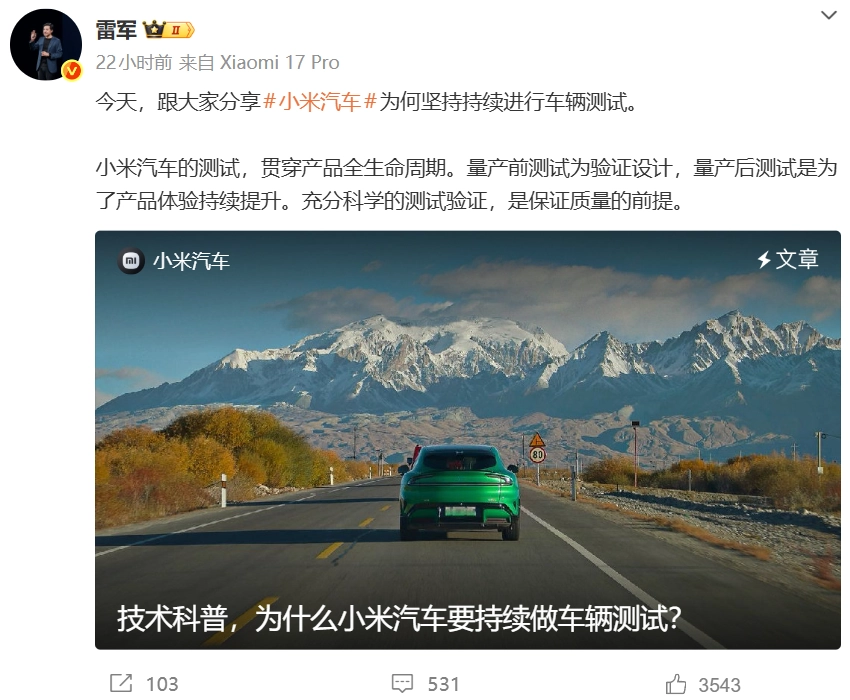 他最近在回应相关质疑时强调,小米对测试的“重视度、投入规模和测试里程,都是远超行业平均水平的”。数据显示,SU7动用了727辆测试车,路测里程超过1300万公里;YU7也投入了664辆测试车,跑了850万公里以上。