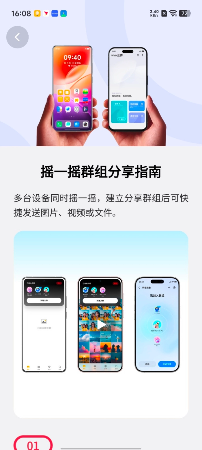 此外,系统支持 跨品牌互传功能,不同品牌的手机只需“摇一摇”即可创建群组,随后便能在相册中选择任意数量的照片或视频进行高速分享。整个过程无需流量、传输稳定,极大提升了多设备间的内容互通体验。