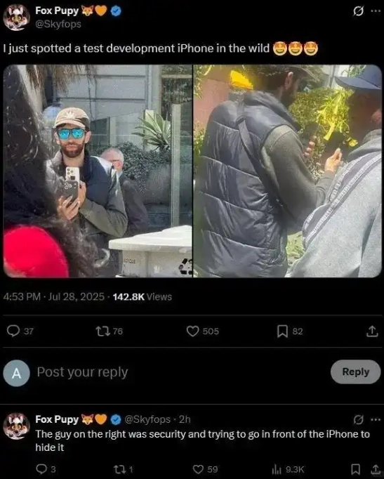 从曝光的照片可见,测试员左手持已上市的iPhone 16 Pro(白色),右手设备则被全黑厚重保护壳严密包裹。尽管外壳刻意掩盖细节,但背部开孔清晰显示三摄位于左侧,右侧预留两颗圆形开孔(推测为闪光灯+LiDAR扫描仪),与此前渲染图曝光的“横向大矩阵”设计完全吻合。现场安保人员试图遮挡拍摄的行为,进一步佐证了新机的重要性。