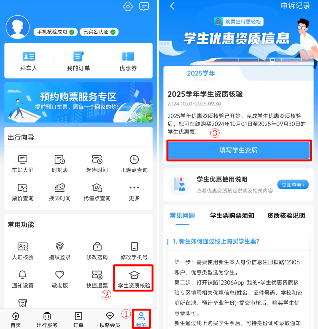 如果你的常用功能里没有学生资质核验,可以更新铁路12306APP的版本哦!