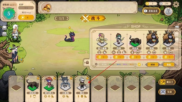 游戏开始后,玩家可在右侧购买棋子,三个相同的棋子能够合成升星。