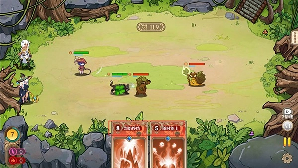 进入战斗后,敌我双方会自动进行战斗,玩家可点击界面下方的卡牌来释放技能,以此更快地战胜敌人。