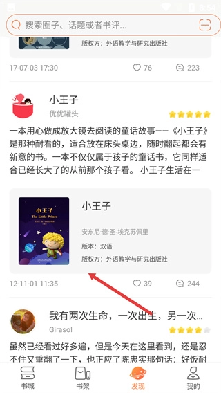 在【发现】页面里,找到关于【小王子】的书评内容后,点击对应的书籍区域,就能进入该书的详情互动界面。