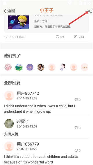 进入《小王子》的详情页面,就能看到“他们赞了”以及对应的回复内容,点击右上角的分享图标,就可以准备挑选分享平台了。