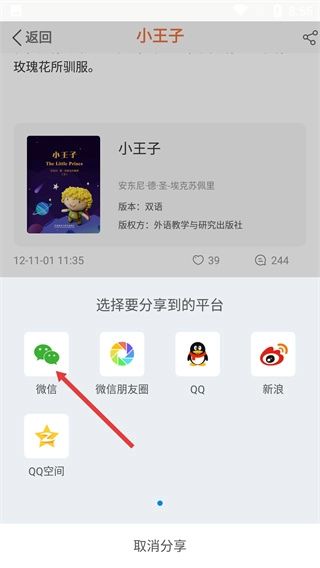 在分享平台的选择界面中,只要选定【微信】这类目标平台,就能把【小王子】的相关内容分享到对应的渠道。