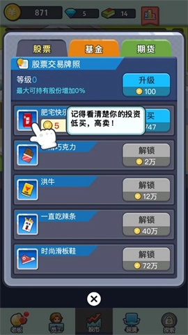 除了员工所提供的项目之外,玩家还能够在股市里自由地进行股票、基金、期货等类型的买卖交易,从而开展多样化的投资活动。