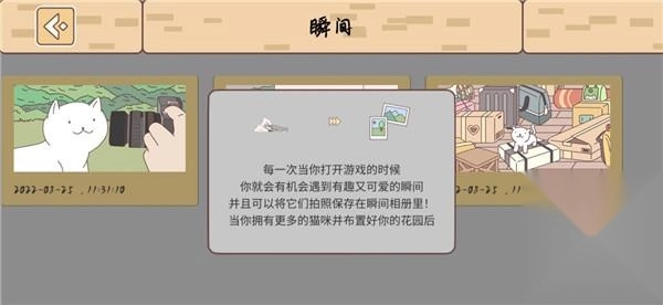 每次你打开游戏,都可能邂逅有趣又可爱的瞬间,还能拍照存进瞬间相册!等你拥有更多猫咪、把花园布置妥当后;