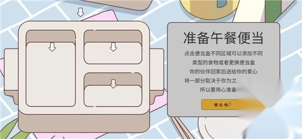 还能准备午餐便当呢,点击便当盒的不同区域就能添加各类食物或者更换便当盒。伙伴回家后给你的爱心,有一部分是看你准备的便当怎么样,所以可得用心准备呀!