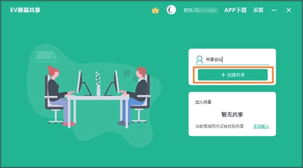 在电脑上打开EV屏幕共享功能,输入本次会议的主题(例如“共享会议”),完成输入后点击“创建共享”按钮即可。