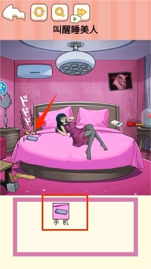 图片里的女孩睡着了,你得找出房间内能够用来叫醒她的工具,像手机闹铃之类的都可以。