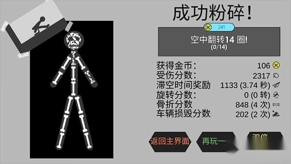 火柴人身上共有十三根骨头。在越短的时间内完成操作,获得的分数就越高。不过要注意,若不合理地使用车辆,或是摆出一些特别奇怪的姿势,都很容易导致你摔倒。