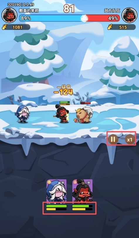 屏幕下方能看到每个英雄的血量与怒气条,英雄攻击或受到攻击时怒气都会增长,怒气值满了就会释放技能,玩家也可以设置自动战斗或者调整战斗倍速。