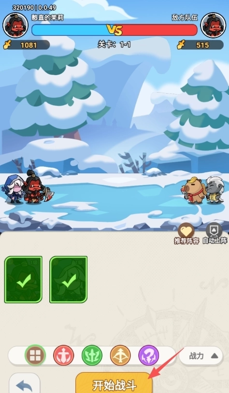 上阵所有的英雄,点击屏幕下方的“开始战斗”。