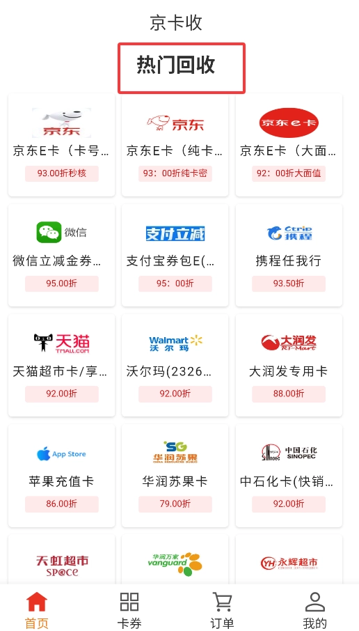 启动后,首页“高价回收”专区会实时显示热门礼品卡、购物券的回收价格,比如京东E卡的回收价为9.2折。