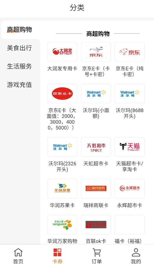 可以通过分类筛选功能,按照卡类型(电商/餐饮)、面值等条件快速找到目标卡券,同时还支持比价功能。
