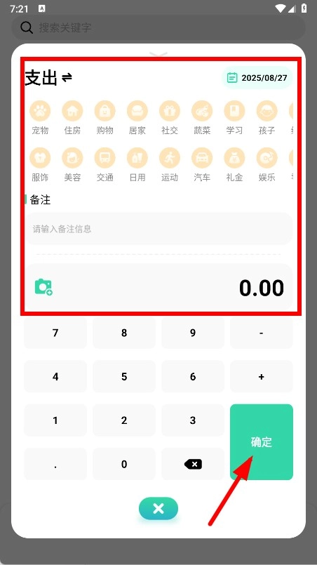 填写支出分类、备注和金额,点击确定按钮,即可完成消费记账操作。