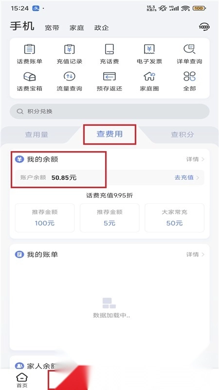 在“查询办理”板块里找到查费用的选项,点击进入后页面就会展示出当前账户的余额情况。