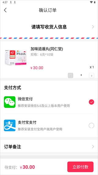 在完成付款操作前,请您先填写好送货所需的相关信息,之后您就可以选择使用微信支付或者支付宝这两种方式来进行付款了。