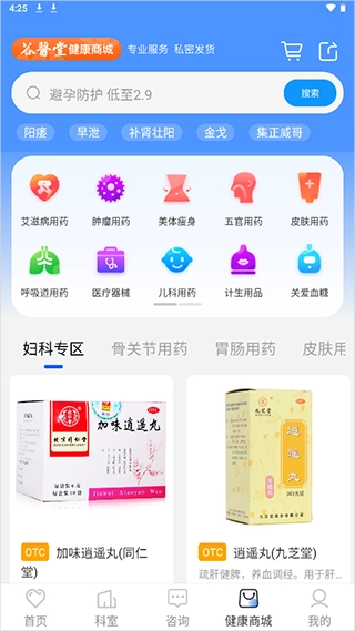 用户进入应用的健康商城页面后,可进入湖南顾毅堂移动网上药房,根据自身情况选购药品。