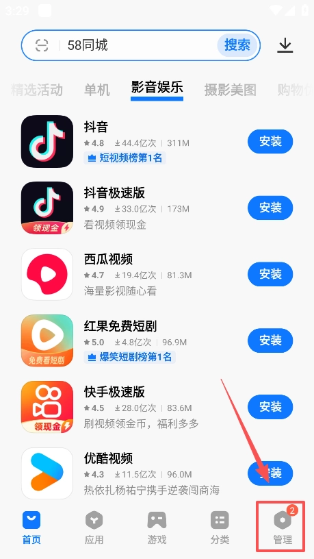打开vivo应用商店,点击右下角管理。