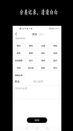 收支记录:对每一笔收入与支出的时间、金额、所属类别以及备注信息进行详细登记,便于用户能够随时查阅和回想相关情况。