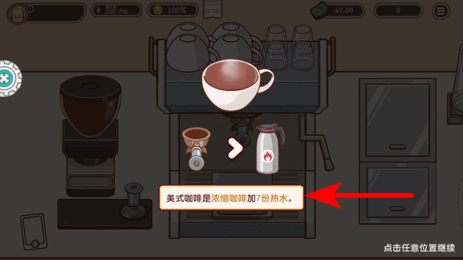 查看美式咖啡的制作提示:浓缩咖啡需加入7份热水,明确该制作配方后再继续后续操作。