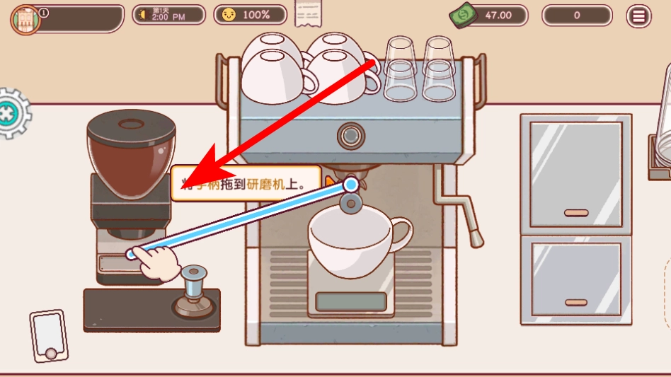 根据指引把手柄拖至研磨机处,开启咖啡研磨流程,以便为制作浓缩咖啡做好准备。