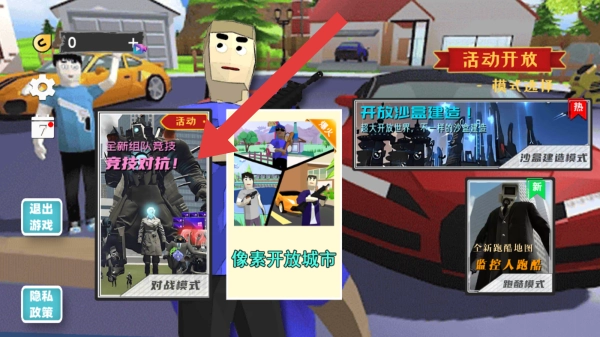 呈现像素开放城市等模式,包含对战模式、开放沙盒建造等玩法选项,展示玩法模式选择场景。