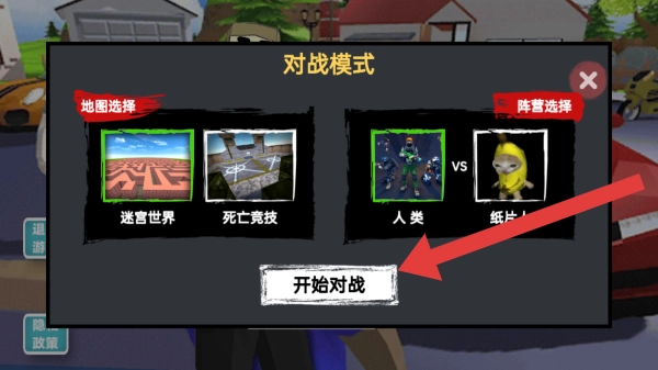 可以选择迷宫世界或死亡竞技地图,也能挑选人类或纸片人阵营,点击开始对战按钮后,就会进入对战前的模式与阵营配置场景。