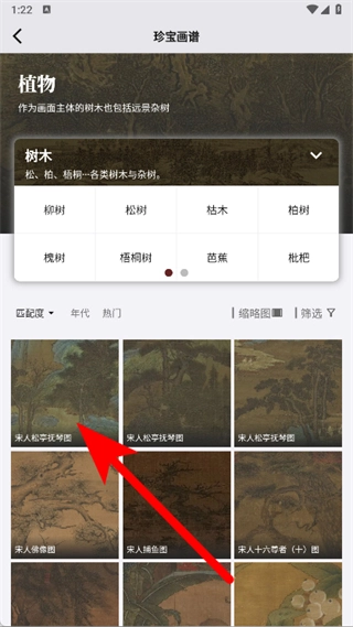 若想按主题浏览古画,可通过珍宝画谱入口,选择植物等分类,再进一步筛选树木等细分主题。