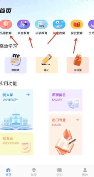 进入首页后,会呈现多种不同教育形式的内容,你可以根据自身需求挑选合适的进行学习。