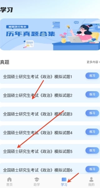 点击“学习”按钮后,系统将为你提供各类历年真题,方便你进行模拟测试。